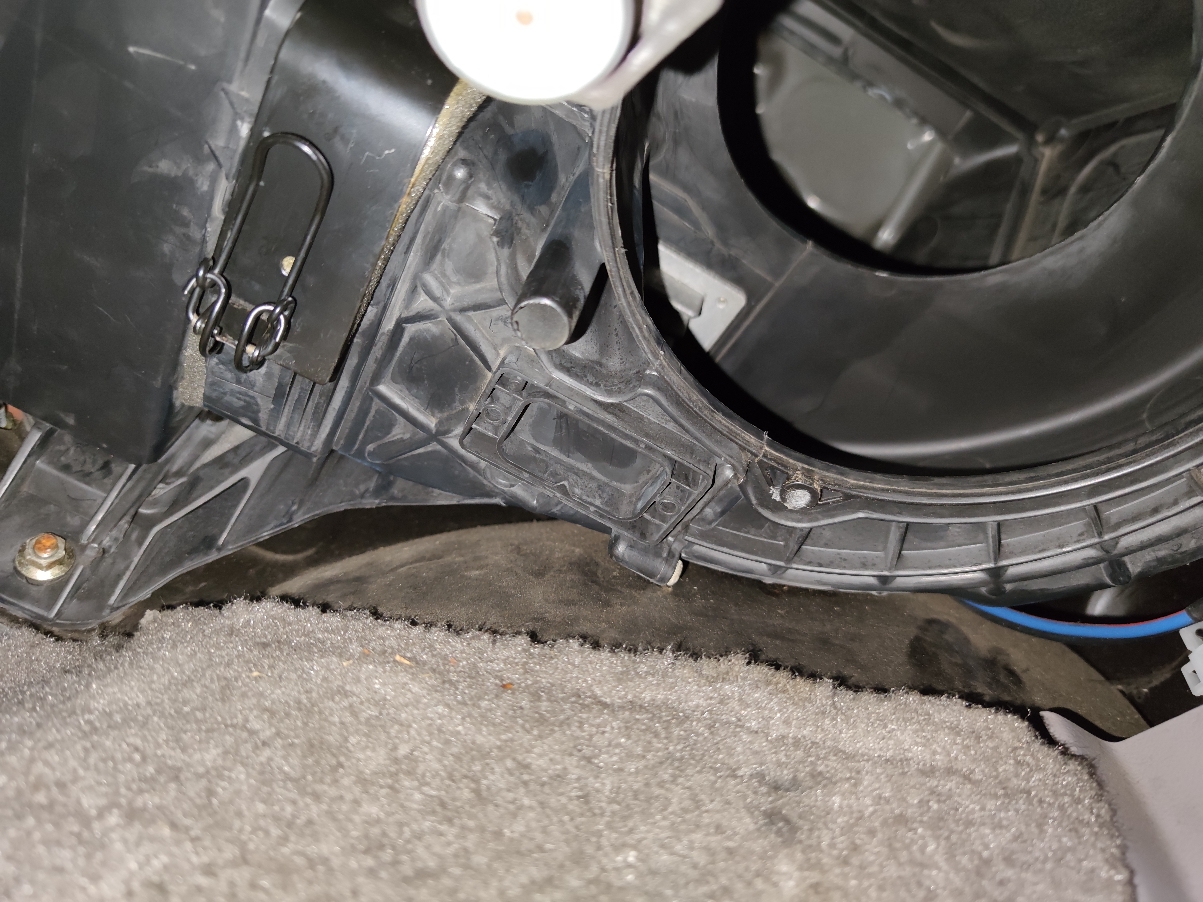 Szukamy wiązki przewodów biegnących za dmuchawę (gruby czerwono-żółty, gruby niebiesko-biały i cienki niebiesko-pomarańczowy)