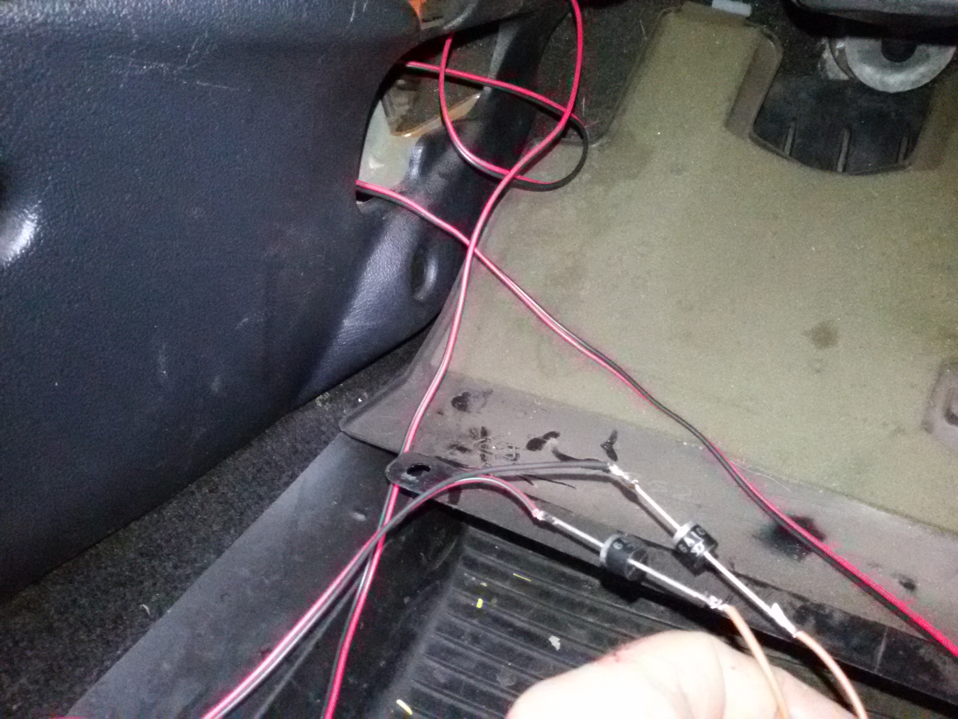 3. Następnie trzeba znaleźć źródło zasilania dla naszej centralki. Ja podpiąłem się pod zapalniczkę. Do tego celu podnosimy środkowy tunel i podpinamy pod zapalniczkę dwa przewody (czerwony + i czarny -) które łączą się z naszą centralką. Przewody można bez problemu przełożyć od środkowego tunelu poprzez środkowy panel (są tam otwory nie trzeba nic dodatkowo rozbierać) rys.4