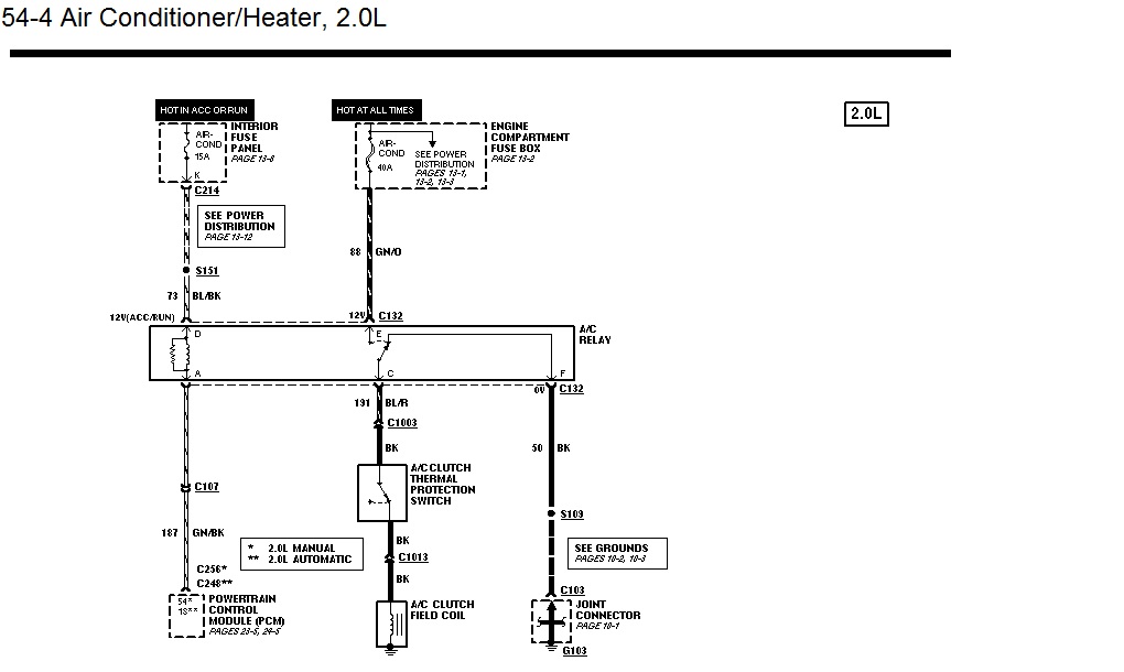 Ze schematu wynika, że minus z cewki przekaźnika ma iść na PCM poprzez wtyczkę C107 a z czujnika niskiego ciśnienia też na pcm a drugi ma iść na sprzęgło sprężarki i na przełącznik klimatyzacji w kabinie. Pytanie jest takie, czy miałeś rzeczywiście od początku silnik 2.0 bo niektórzy tak jak u mnie robili przeróbki i wsadzali silniki 2.0 a wcześniej był 2.5.