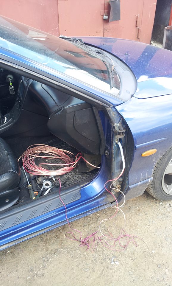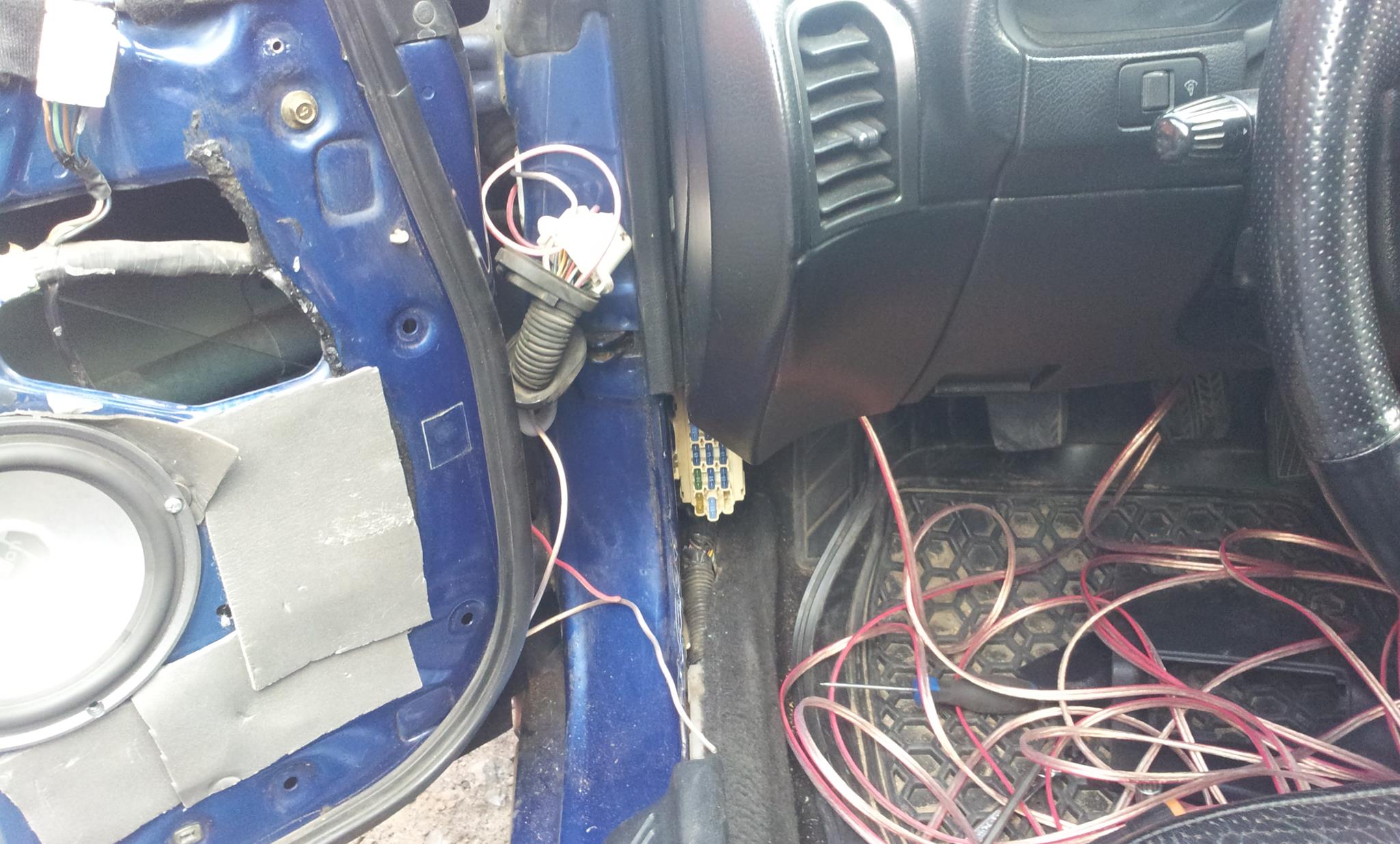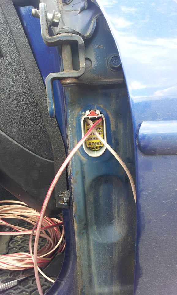Montaż kabli głośnikowych przez kostki w drzwiach