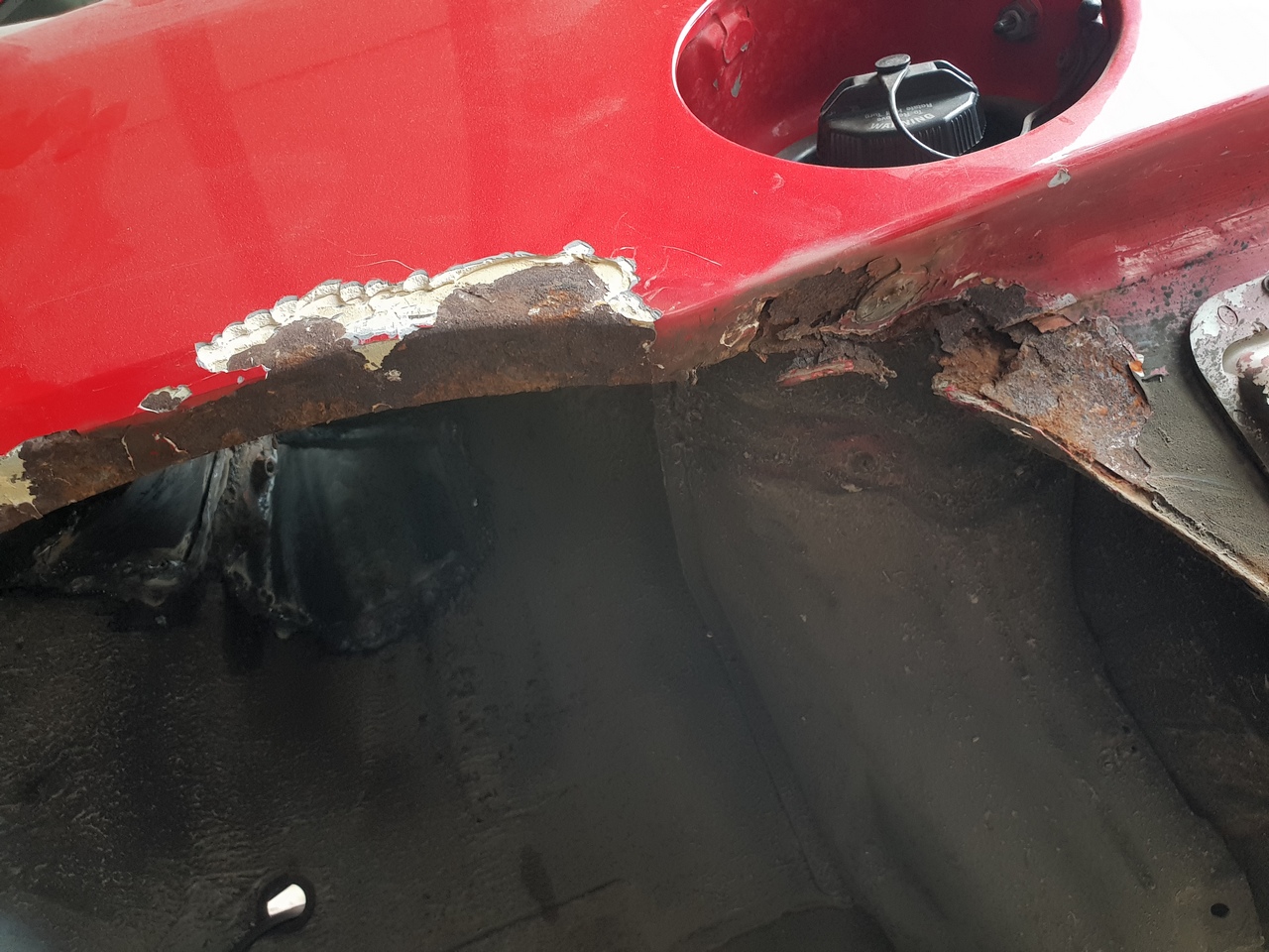 Prawy i lewy błotnik przód, nadkole prawy i lewy przód, nadkole lewe tylne, końcówki progów lewa i prawa strona tył, kielichy lewy i prawy przód, lewy tył, podłoga w miejscu nóg pasażera, nad belką tylną, okolice mocowania zawiasu lewych drzwi, krawędź przy szybie na słupku lewych drzwi, końcówka klapy tylnej, krawędź pasa tylnego, krawędzie dolne drzwi kierowcy.