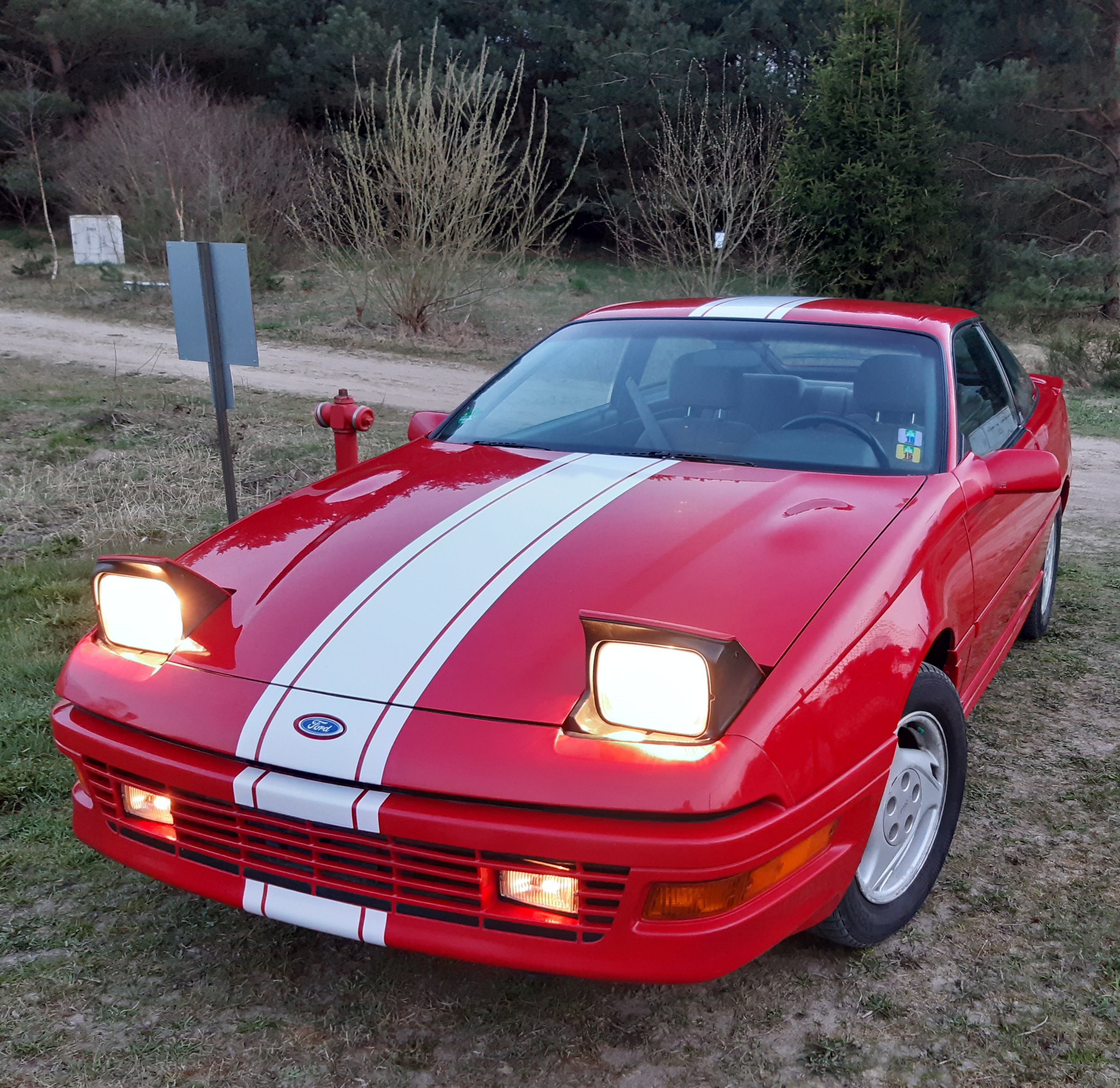 - Oryginalny lakier czerwony niewypłowiały. Dwa tylne błotniki polakierowane ponownie w latach 90 w ASO Ford Niemcy z powodu obcierek parkingowych. Reszta oryginał.