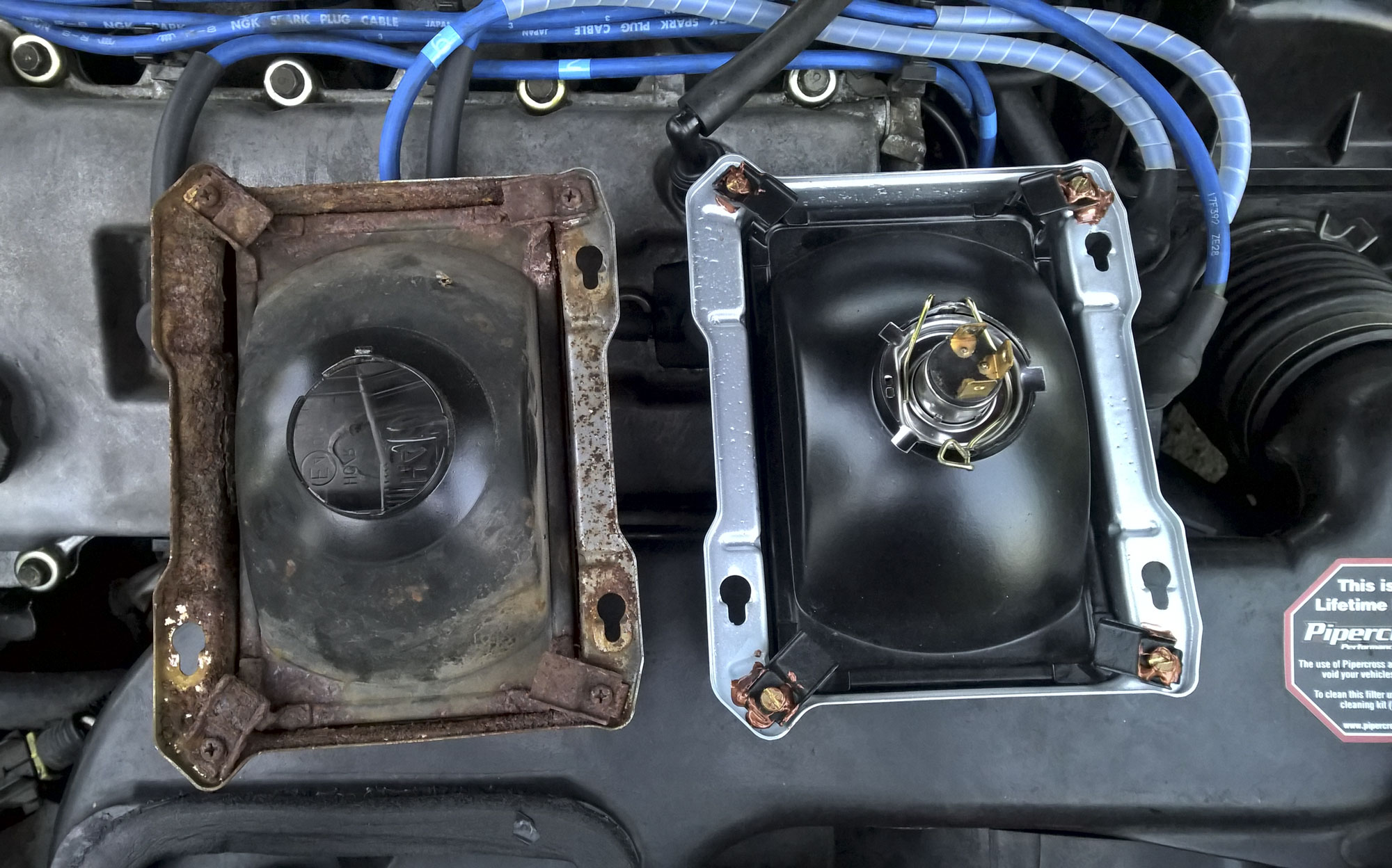 Jeszcze trochę i reflektor mógłby wylecieć z przeżartej ramki. Stare poszły do kosza bo były już nie do uratowania.