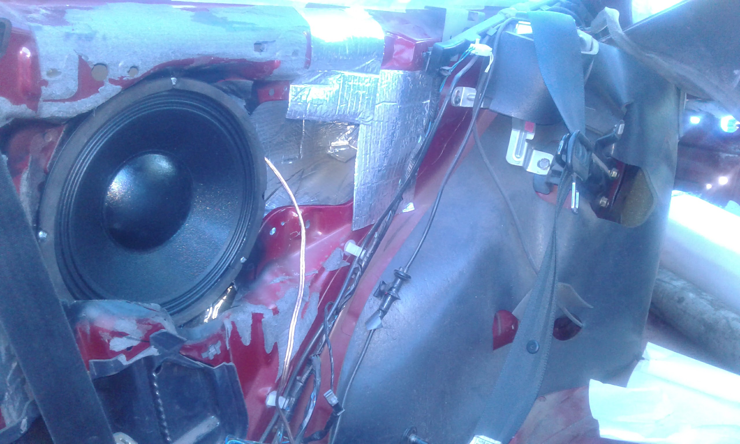 Tak mi się udało wcisnąć moje głośniki w miejsca oryginalnych tylnych jaj. Środek głośnika wychodzi dokładnie po środku maskownicy w boczku. Są to głośniczki, które posiadają twarde zawieszenie i nawet bez skrzyni dość przyjemnie grają. Ja teraz mając zrobioną taką ogromniastą dziurę miałem możliwość poprawienia wygłuszenia z tyłu, więc nie powinno być źle. Ten kawałek blachy, który zachodzi nad głośnik to jest punkt podparcia boczka. W ten sposób będę miał dość spore głośniczki, których w ogóle nie będzie widać. Są to głośniki basowe, więc nie powinno być problemu z ich słyszalnością, mają wibrować