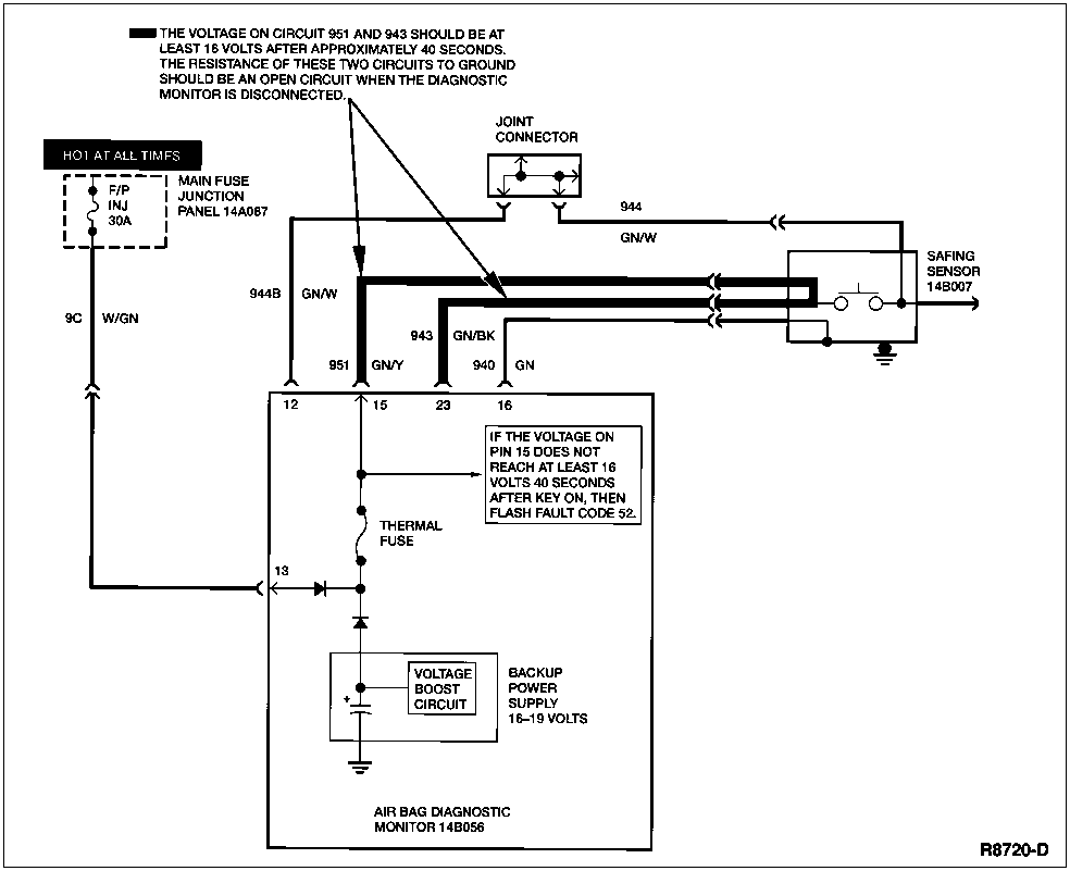 A backup power supply is contained within the air bag diagnostic monitor that consists of four capacitors and a voltage boost circuit. The voltage boost circuit charges the capacitors to 16-19 volts when the air bag diagnostic monitor is turned to ON. The backup power supply is connected through a diode to the air bag diagnostic monitor pin 15 (circuit 951 "GN/Y"). The resistance of circuit 951 should have infinite (open) resistance to ground. The air bag diagnostic monitor measures the voltage on the backup power supply capacitors. If the voltage on the capacitors does not reach a minimum of 16 volts after approximately 45 seconds, the air bag diagnostic monitor will flash a code 52 to indicate low voltage in the backup power supply voltage boost circuit.