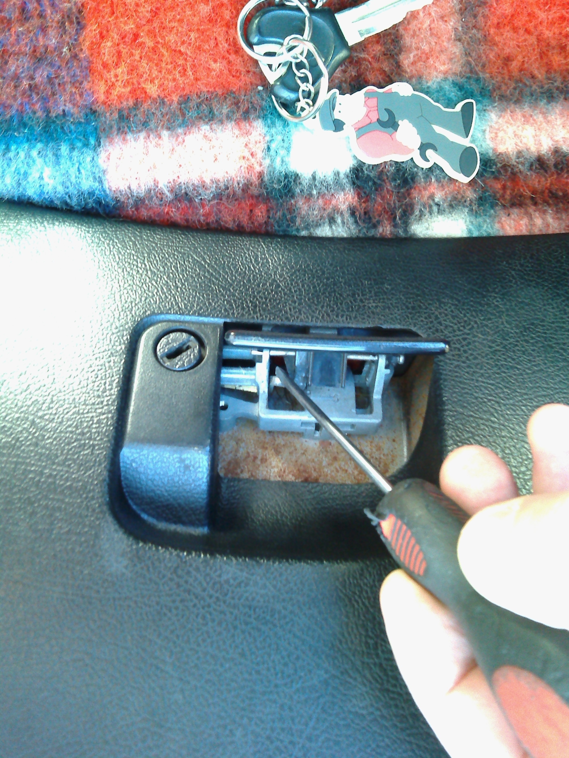 pod klamką schowka widać cały mechanizm, wystarczy czymś długim, cienkim i twardym nacisnąć zapadkę koloru złotego, aby zwolnić zatrzask zamka