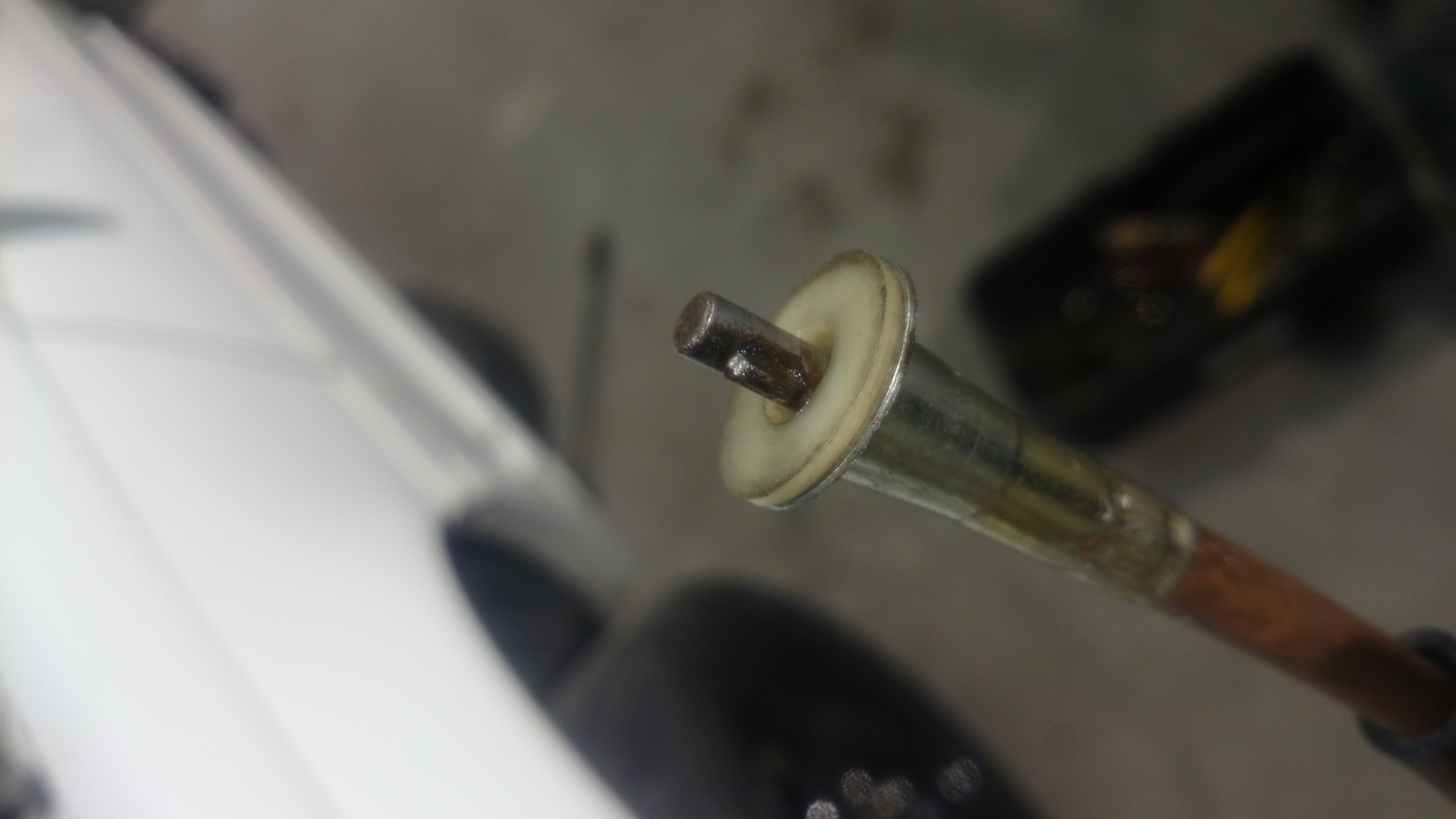 Jak widać na zdjęciu - trzpień wchodzący w ślimak jest zbyt głęboko - jedyny winowajcą jest metalowa nasada która przy ciągnięciu została lekko obsunięta. BIerzemy szczypce kombinerki etc i delikatnie próbujemy rozruszać ten element - ja psikłem cx żeby nabrało poślizgu i wziąłem klucz oczkowy 18 i uderzałem w nasade tego metalowego kołnierza żeby wszedł głębiej na linkę - poskutkowało. Na początku za dużo nabiłem - czego efektem był problem z doleganiem plastikowej uszczelki/dystansu który jest na końcu.