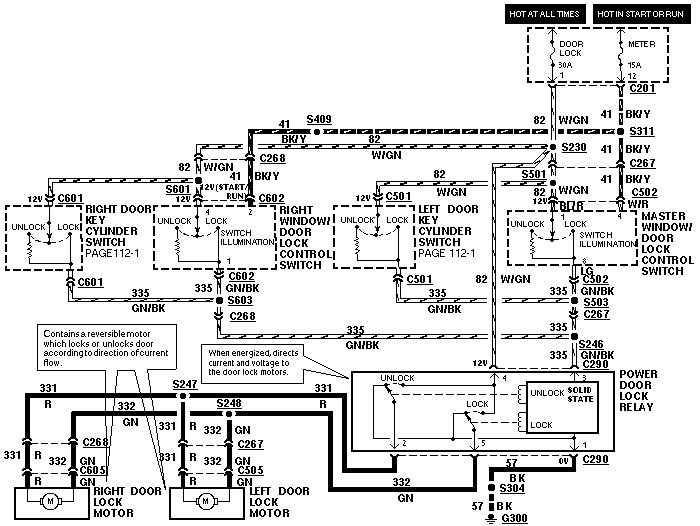 Podsumowując: nic (oprócz kluczyka w tymże zamku) nie otwiera Ci lewego zamka, a prawy działa również zdalnie. Czyli do S247 i S248 dochodzi prąd, a przerwa jest gdzieś dalej, pomiędzy tym złączem a lewym silniczkiem (pewnie wypięta któraś z kostek C267 albo C505, ew. przecięte kable czrwony lub zielony na tym odcinku, ale kostki sprawdzisz szybciej).