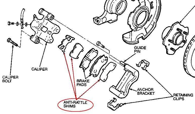 Dołączę się do tematu, przeglądałem sobie Ford Technical Service Publications «Section 06-03: Front Disc Brake» i znalazłem coś ciekawego. Powiedzcie czy macie u siebie takie coś jak podkładki anty-grzechotka (anti-rattle shims)?