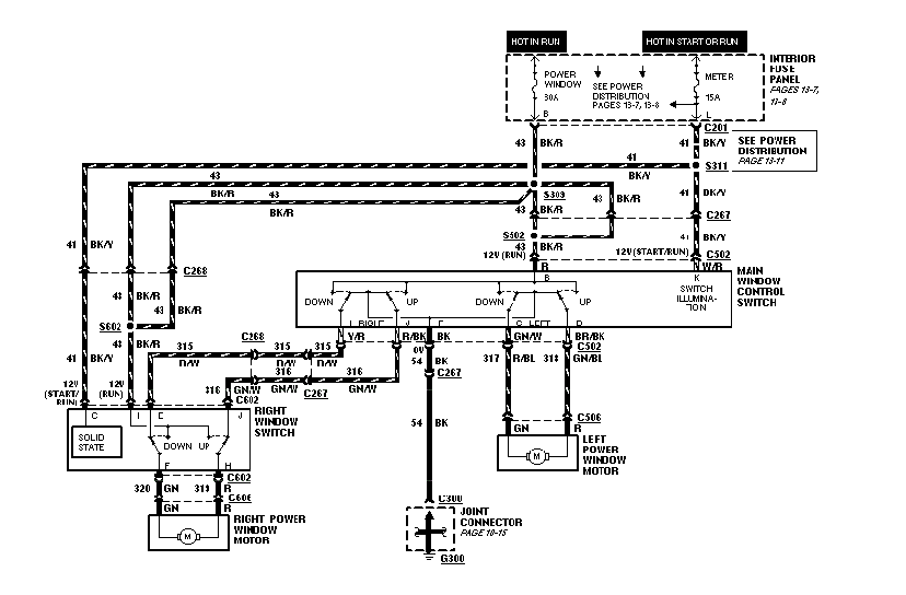 Po pierwsze wyciągnij przełącznik z lewych drzwi i odepnij kostkę sterowania szybami, sprawdź czy na czarnym przewodzie jest przejście do karoserii. Jeżeli nie ma to trzeba odszukać złączkę C267, która jest gdzieś nad nogami kierowcy. To prawdopodobnie ona zawiodła. Niestety nie mam jest rysunku, FORD nie dodał go do manuala. Dalej jest C300 ale tam dochodzi tez wiele innych mas więc to raczej odpada.