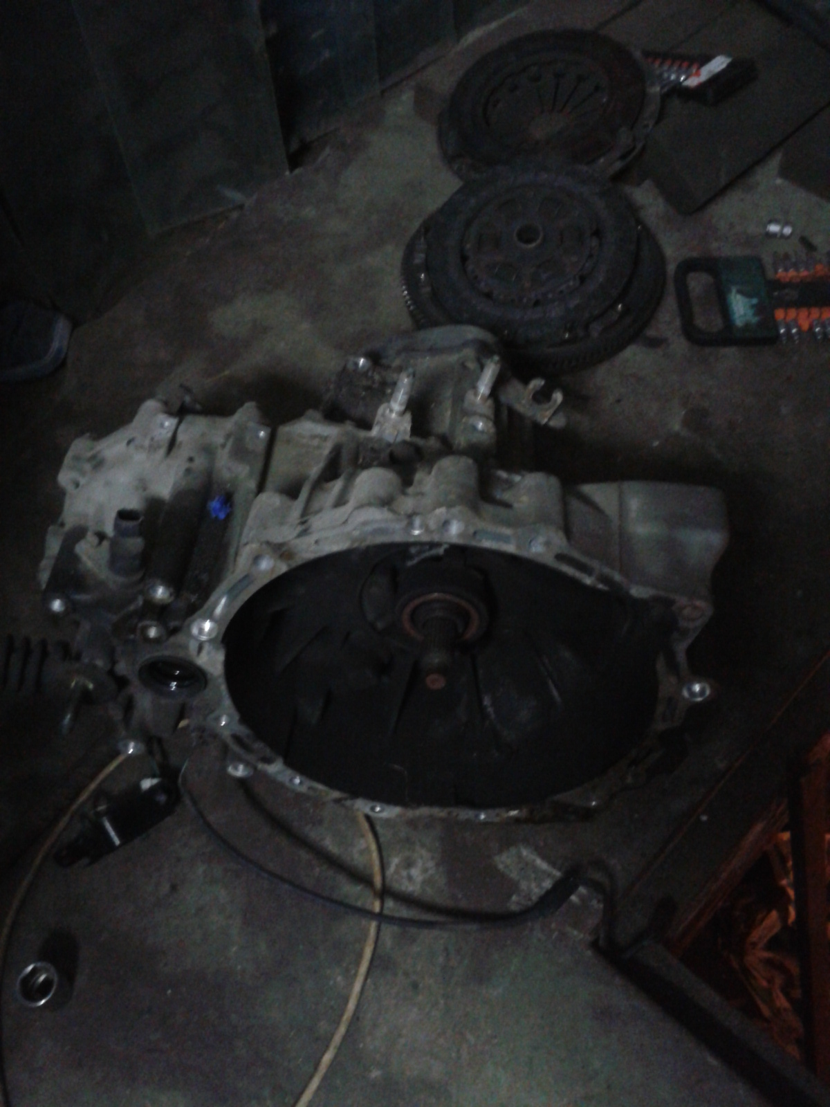 Przed włożeniem do auta, cały komplet (sprzęgło, docisk, zamach) pojechał do Wróbla na niezbędne zabiegi - nabicie tarczy kevlarem, rewizję docisku z wymianą sprężynek, zabielenie koła zamachowego i wymianę łożyska.