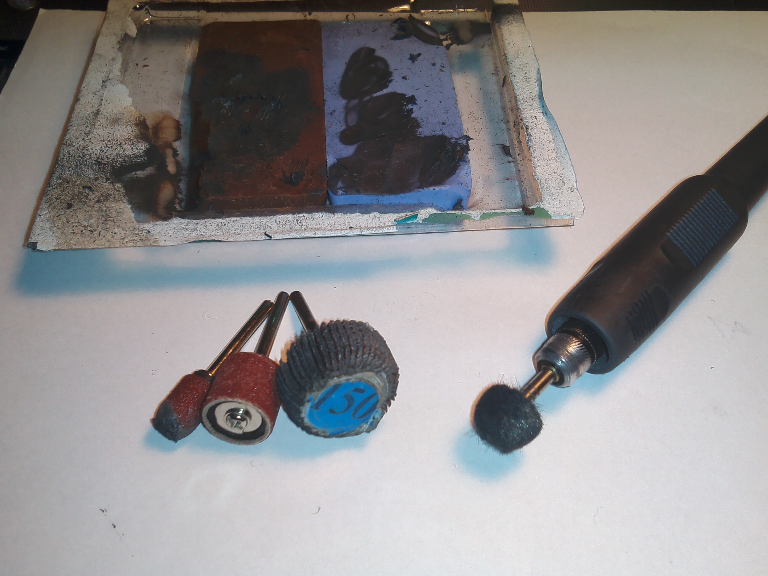 W końcu osiągnąłem zadowalający efekt. Najpierw oczyściłem komorę z nagaru, do tego celu użyłem szlifierki trzpieniowej z papierem ściernym na rolce na rolce, dość gruby bo 80 ale przy delikatnym traktowaniu do usunięcia nagaru się nadaje, później też papier ścierny na trzpieniu ale z listkami o gradacji 150. Oto moje narzędzia, nie ma tylko papieru. Później to już z górki, wszystko czyściłem papierami wodnymi kolejno 150, 180, 240, 320, 600, 1800 i 2500