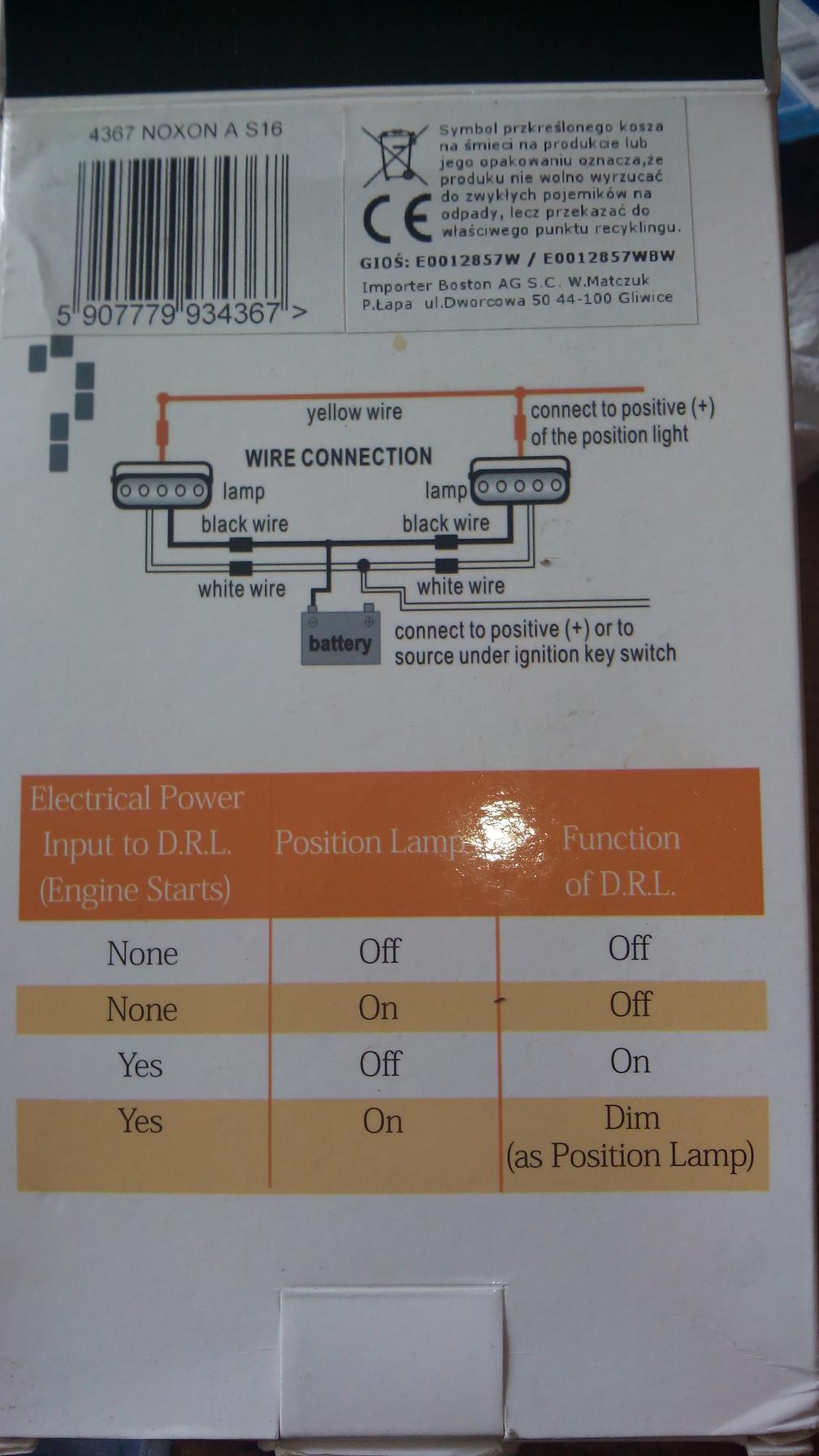 i wg instrukcji DRL to kabel czarny poszedł do (-), kabel biały do nr. 5 "Wszystkie układy załączane przez stacyjkę", zielony do postojówki ... i lipa.