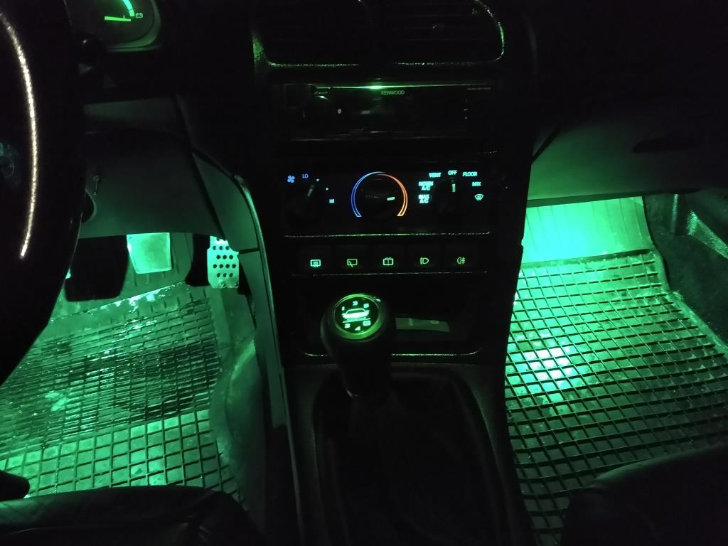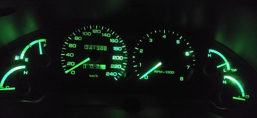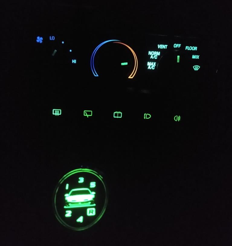 Podświetlenie zielone ponoć niemodne, ale dla mnie idealne. Oryginalne żarówki już miejscami się powypalały a ocalałe świeciły blado. Stąd decyzja o zmianie wszystkich na zielone ledy. W panelu nawiewów niestety to nie zagrało i pod regulacją temperatury jest led bardzo jasno zielony (żeby pasek czerwony od ogrzewania był czerwony, a nie zielony) a pod regulacją siły nadmuchu - led biały. Finalnie daje kolor niebieski, co nawet pasuje kolorystycznie. Przyciski w drzwiach też świecą
