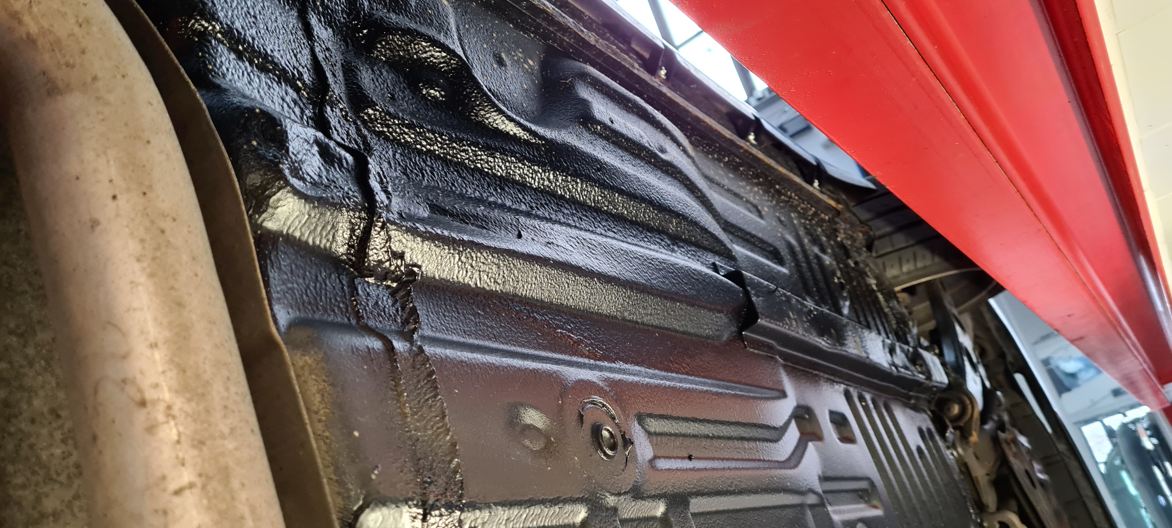 Zdarłem wszystkie warstwy lakierów i podkładów które nosił probe do gołej blachy, zabezpieczyłem wszystkie ogniska korozji i przystąpiłem do dalszych prac na tyle ile czułem się na siłach. Na finalne lakierowanie i wymianę progów oddałem już Forda do lakierni. Została zrobiona również konserwacja podłogi oraz profili zamkniętych.