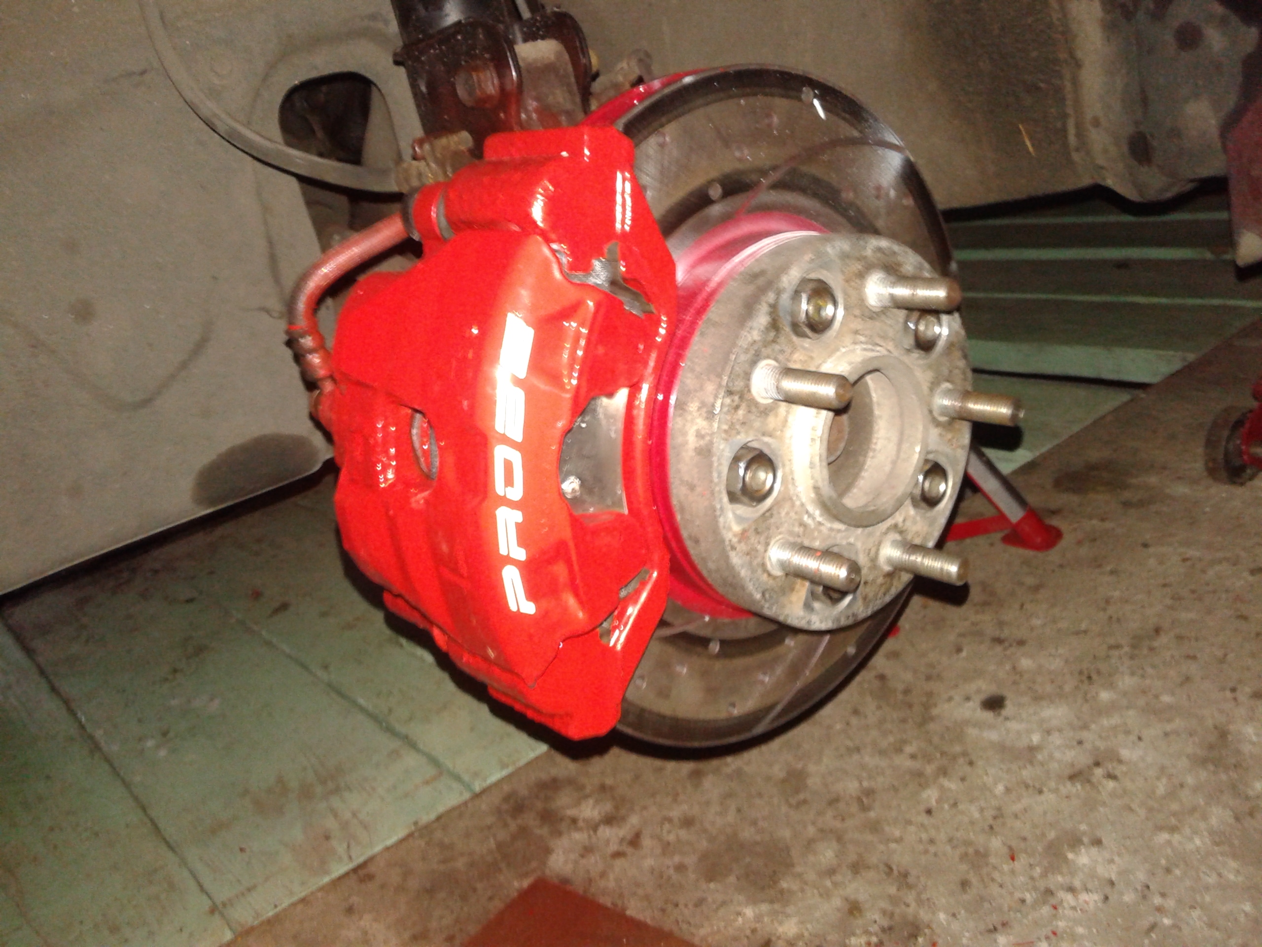 Lakier VHT do malowania elementów silnikowych. Odporny na wysokie temperatury. Pod spodem są 3 cienkie warstwy białego, później nakleiłem naklejki (jako szablony) potem wystarczyło prysnąć czerwonym, żeby wyszło gładko to musiałem ze 4 razy (nie liczyłem). Na końcu odkleiłem naklejki i efekt widoczny na zdjęciu. Podobnie będę działał z zaciskami z przodu, tylko tam zostawię napis PROBE. Jak zrobię to oczywiście wrzucę fotki.