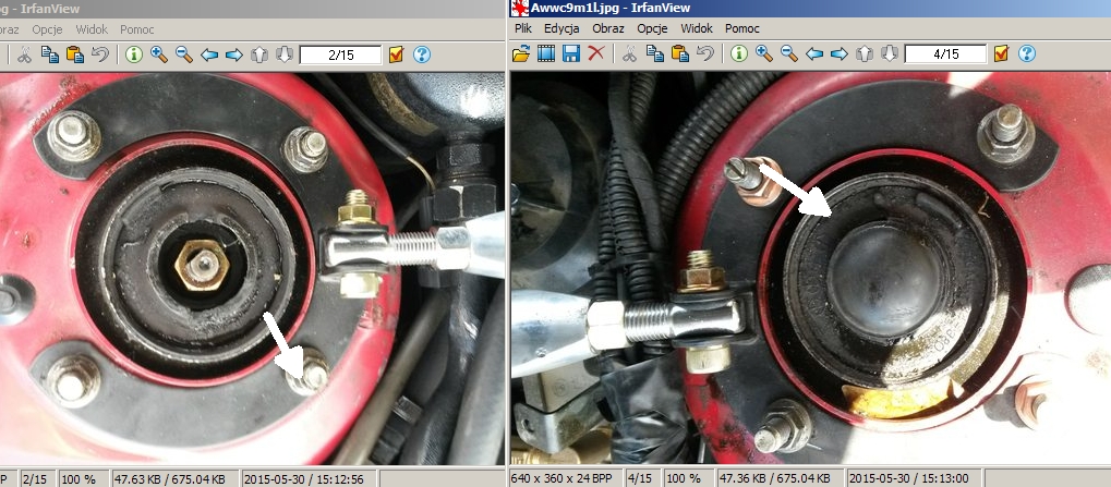 Z tyłu wymienione 2 tuleje wraz z śrubami odpowiadającymi za zbieżność, stare były zapieczone. Chciałem wymienić też 2 tuleje obok nich, ale śruby okazały się również zapieczone. Geometria wyszła dobrze, tył został unormowany. Oczywiście nadal ściąga. Już jestem pewien że to będzie źle wyzerowana maglownica, chyba tylko to zostaje. W mcpersony wątpię, bo znalazłem zdięcie i przed wymianą były tak samo ustawione. Oprócz tego kierownica ma większy obrót przy skręcaniu w lewo, niż przy skręcaniu w prawo, a chcąc jechać prosto muszę trzymać kierownicę nie idealnie równo, a trochę przechyloną w lewo.