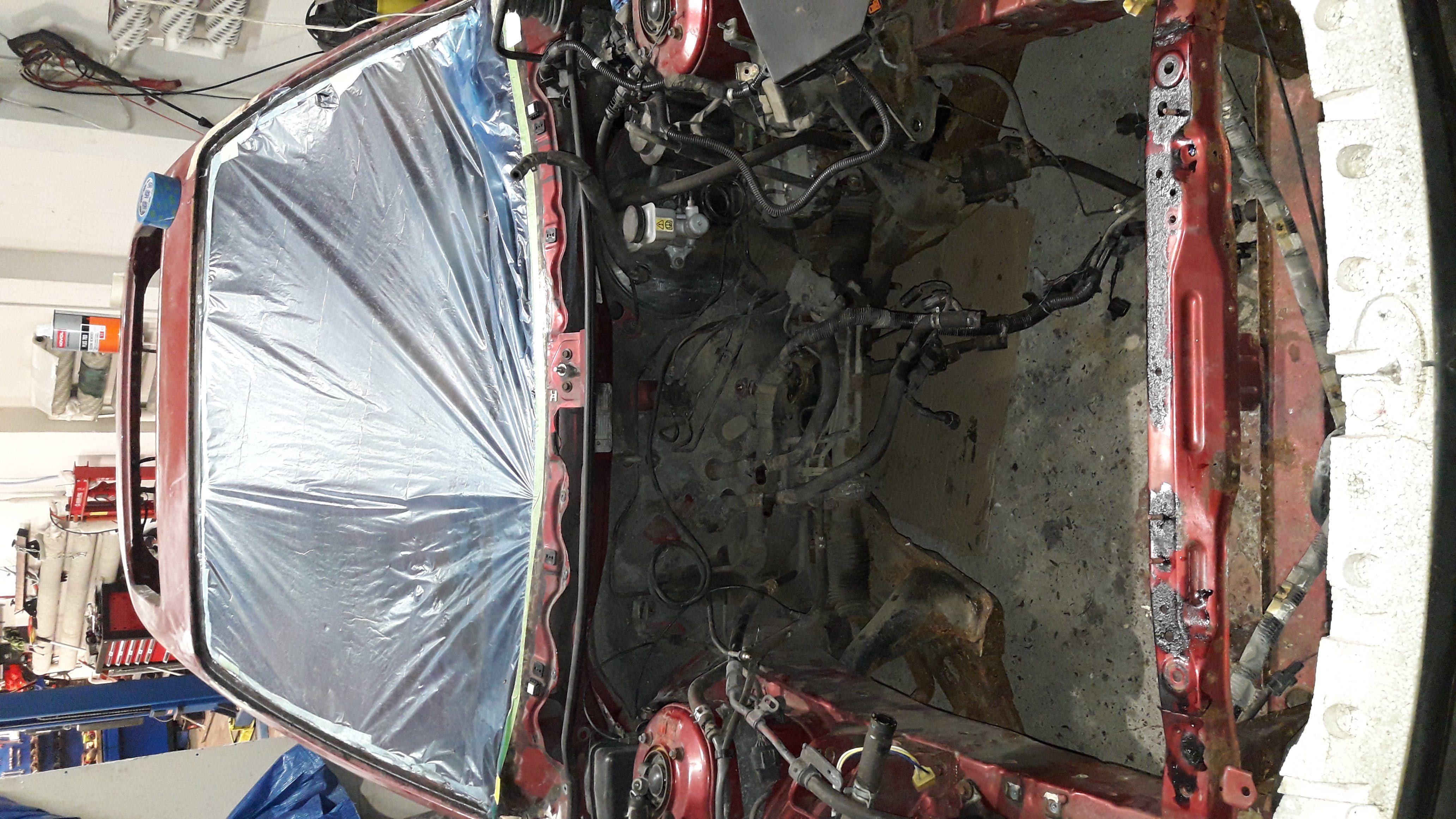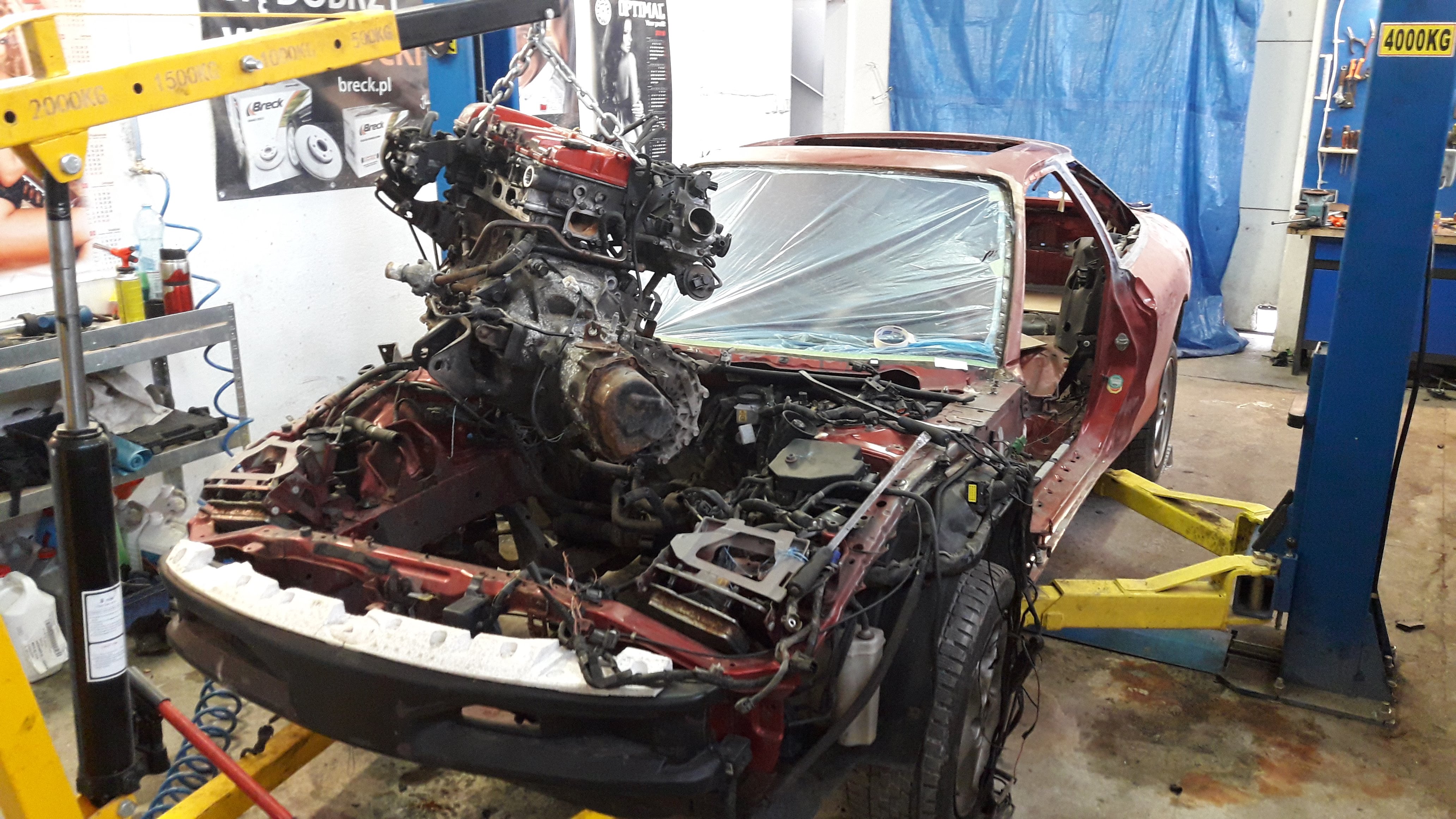 Po wyciągnięciu silnika dokładnie widać w jakim stanie jest przednie zawieszenie. Belka zostanie cała zdemontowana, wyczyszczona i zabezpieczona. Przednie wahacze zostaną wymienione. Wszystkie gumy zawieszenia będą z poliuretanu.