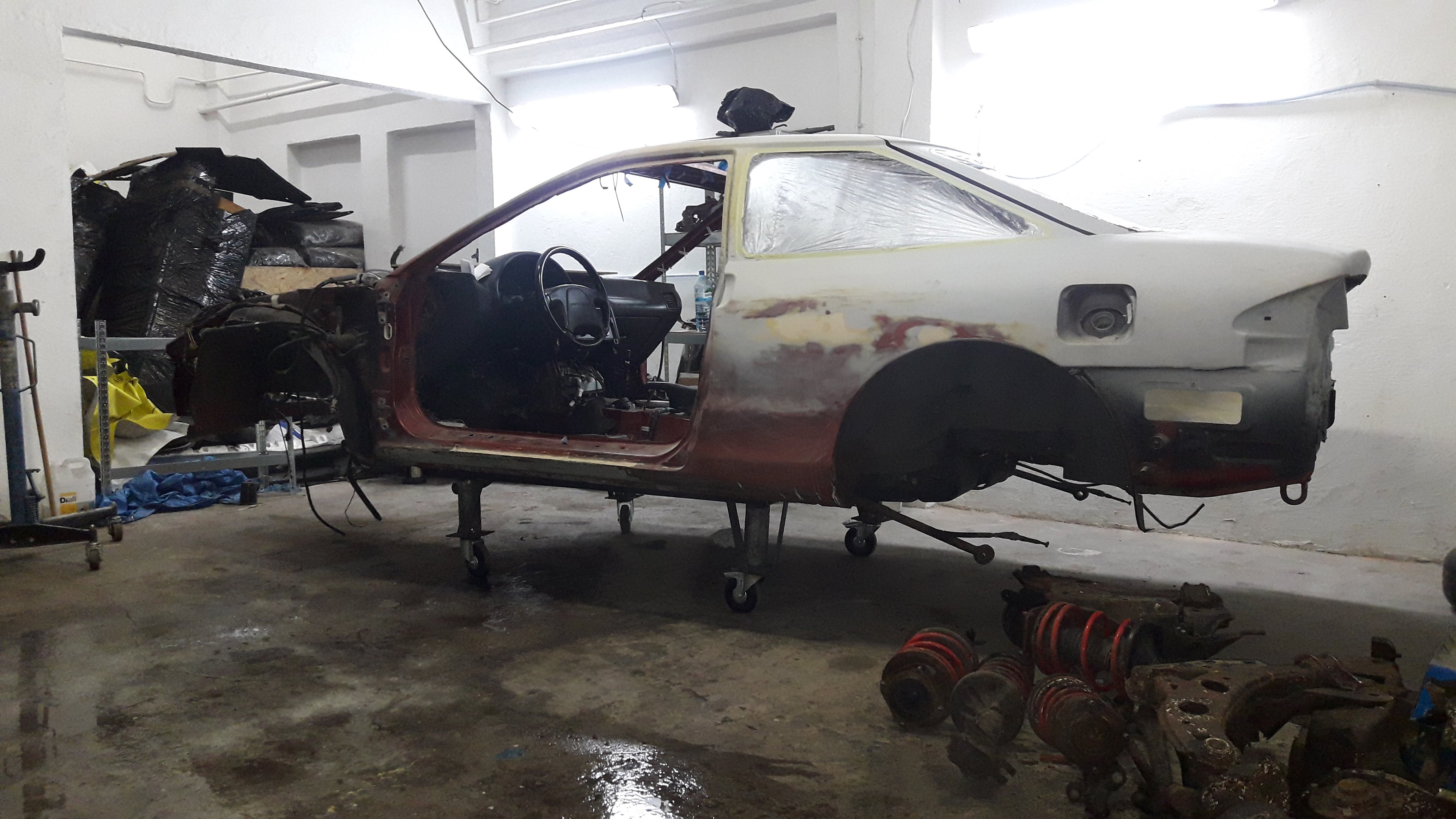 Zrobiliśmy konstrukcję na kółkach na czas kiedy nie będzie zawieszenia, tak aby w zależności od potrzeby można było auto przesuwać po garażu. Dziś zdemontowaliśmy tylną belkę, będzie przy niej sporo pracy
