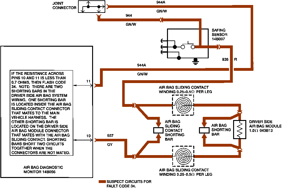 The air bag diagnostic monitor measures the resistance across pin 10 (circuit 937 "GY") and pin 11 (circuit 944A "GN/W") every time the ignition switch is turned to the ON position. Normal resistance across these circuits is between 1.5 ohms and 2.0 ohms. This resistance comes from the air bag module itself (approximately 1.0 ohm) and the air bag sliding contact windings (approximately 0.25 ohms to 0.5 ohms per winding, two windings in all) and the safing sensor (approximately 0.2 ohms). If the resistance across these three circuits is less than 0.7 ohms, the air bag diagnostic monitor will flash a code 34 on the air bag warning indicator.