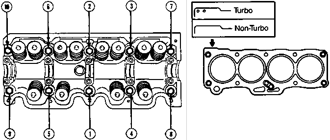 Install the new cylinder head gasket, cylinder head and bolts. Tighten bolts in sequence shown in the following figure, to 40-42 N-m (29-32 lb-ft), then again to 80-86 N-m (59-64 lb-ft).